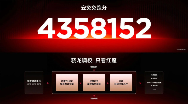 性能方面,红魔 11 Pro+ 搭载骁龙 8 Elite Gen 5 处理器 + LPDDR5T + UFS 4.1 Pro 的性能三件套,还有自研的红芯 R4 电竞芯片加持,外加主动散热风扇和全新的水冷两套散热系统。